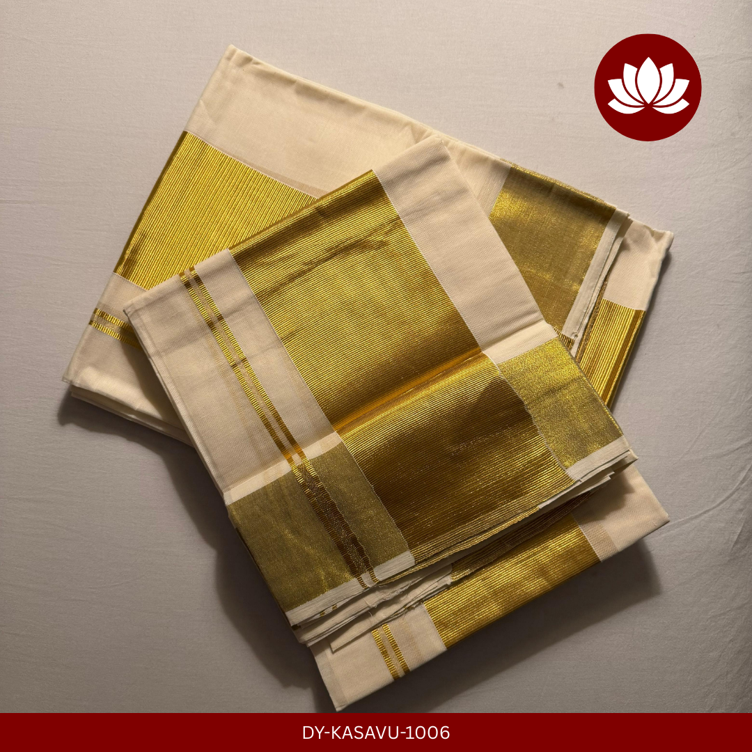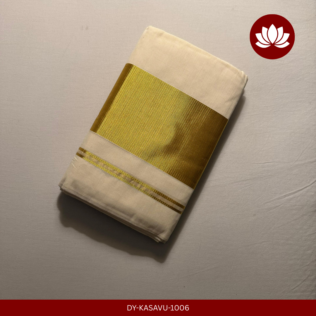 This Broad Kasavu Set Mund is one of the elegant drapes picked from the looms of Balaramapuram. This has a broad Kasavu border of width 4" and comes in an extra length of 2.8m and is a single set mund. Any dark cotton/silk/brocade-silk blouse will be an absolute match.