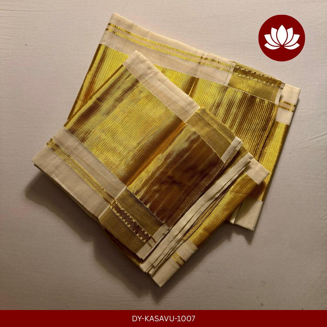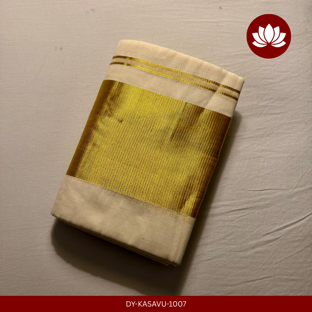 This Kasavu Set Mund is one of the traditional attire from the looms of Balaramapuram. This have a broad Kasavu border of width 5" and comes in extra length of 2.8m and is single set mund. Any dark cotton/silk /brocade silk blouse will be an absolute match.