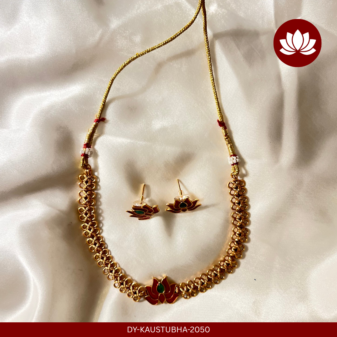 This beautiful jewellery from our Tamara series is Traditional Indian Choker Necklace Set featuring Meenakari work with a crentral Red Lotus motifs.The vibrant deep red color filling the recessed areas of the design is the signature of Meenakari work. This colored enamel contrasts beautifully with the polished gold-toned metal.