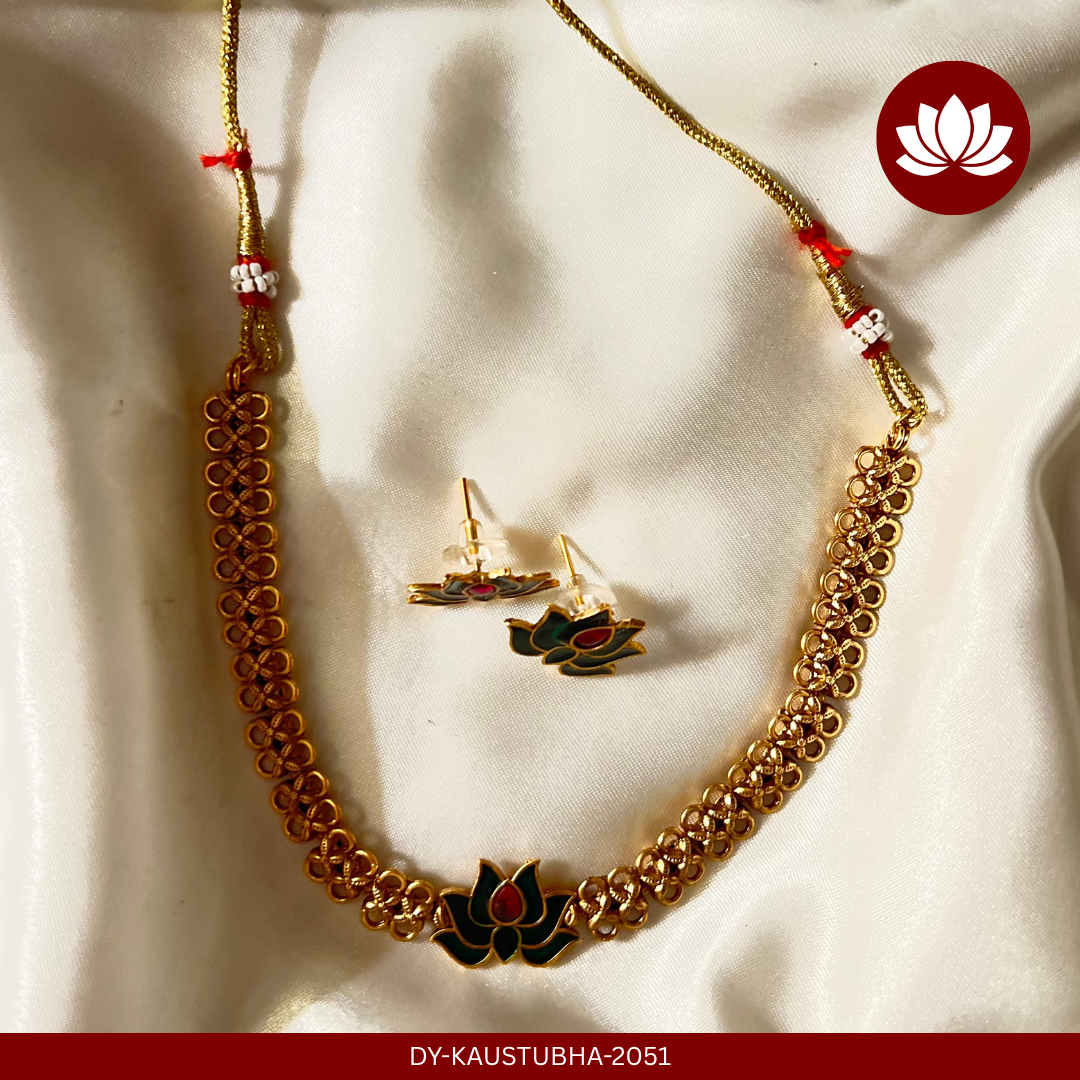This beautiful jewellery from our Tamara series is Traditional Indian Choker Necklace Set featuring Meenakari work with a crentral green Lotus motifs.The vibrant deep green color filling the recessed areas of the design is the signature of Meenakari work. This colored enamel contrasts beautifully with the polished gold-toned metal.