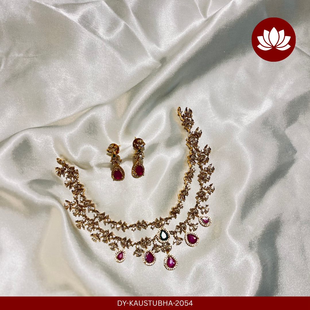 This stunning jewelry set, is a perfect example of modern Kundan-meets-stonework design, blending elegance and tradition.The necklace features pear-shaped red/pink stones as the focal elements, each surrounded by white stones.The central pendant is unique, with a green round stone, giving a lovely contrast to the red teardrops.Double-row design gives it a grand layered look. The beautiful ear rings comes as teardrope shaped red stones matching the necklace centre piece,decorated with the same floral Kundan-style white stones as the necklace- perfect for both bridal and festive occasions.