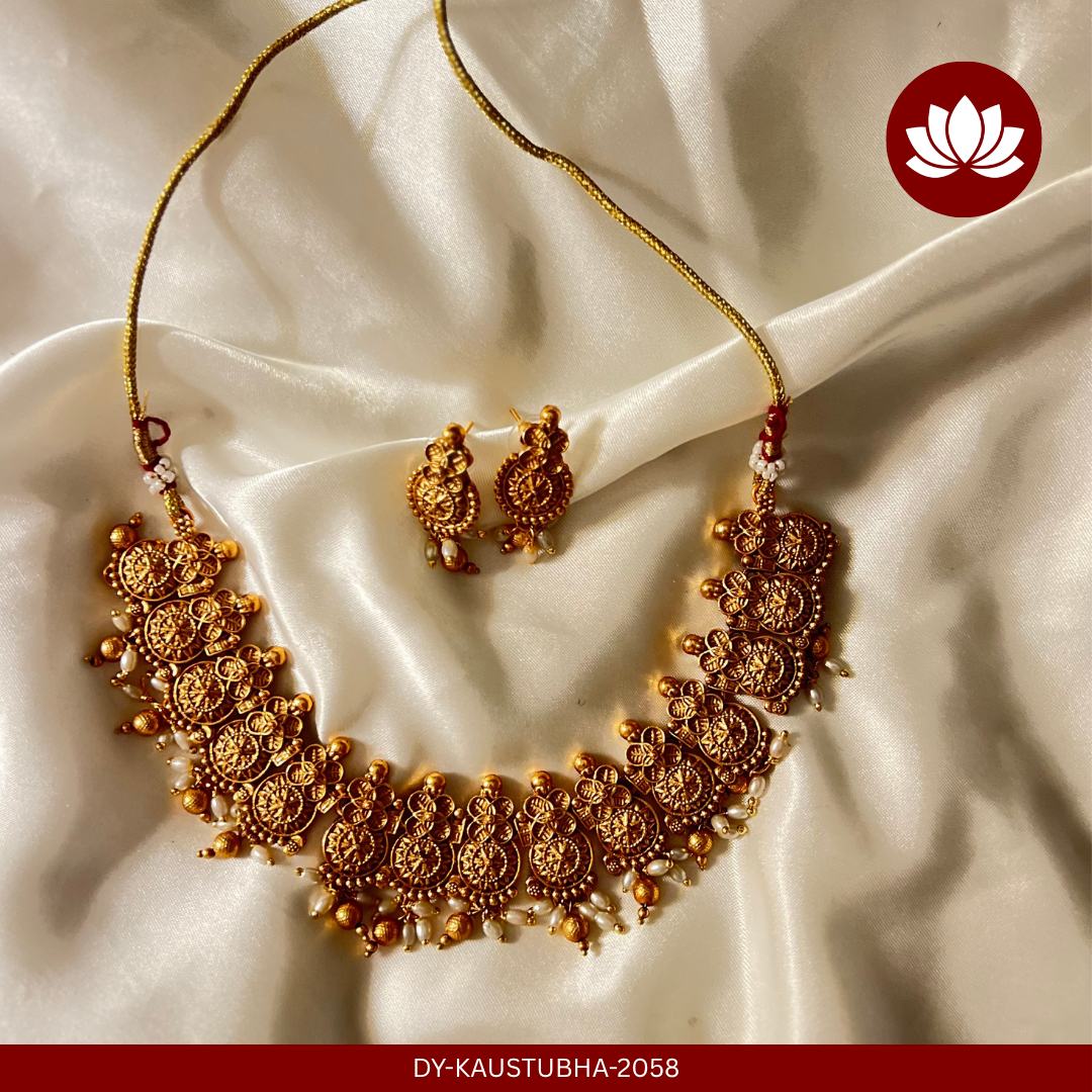 That's a beautiful piece of jewellery! It appears to be an antique-finish gold-tone choker necklace set with matching earrings. This necklace is composed of several circular or medallion-like units linked together. Each unit features intricate floral or geometric engraving and is bordered by small decorative elements. It is heavily embellished with small, off-white or cream-colored pears. This comes with a matching pair of earrings, which are circular studs that match the individual motifs of the necklace and also have pearl drops.