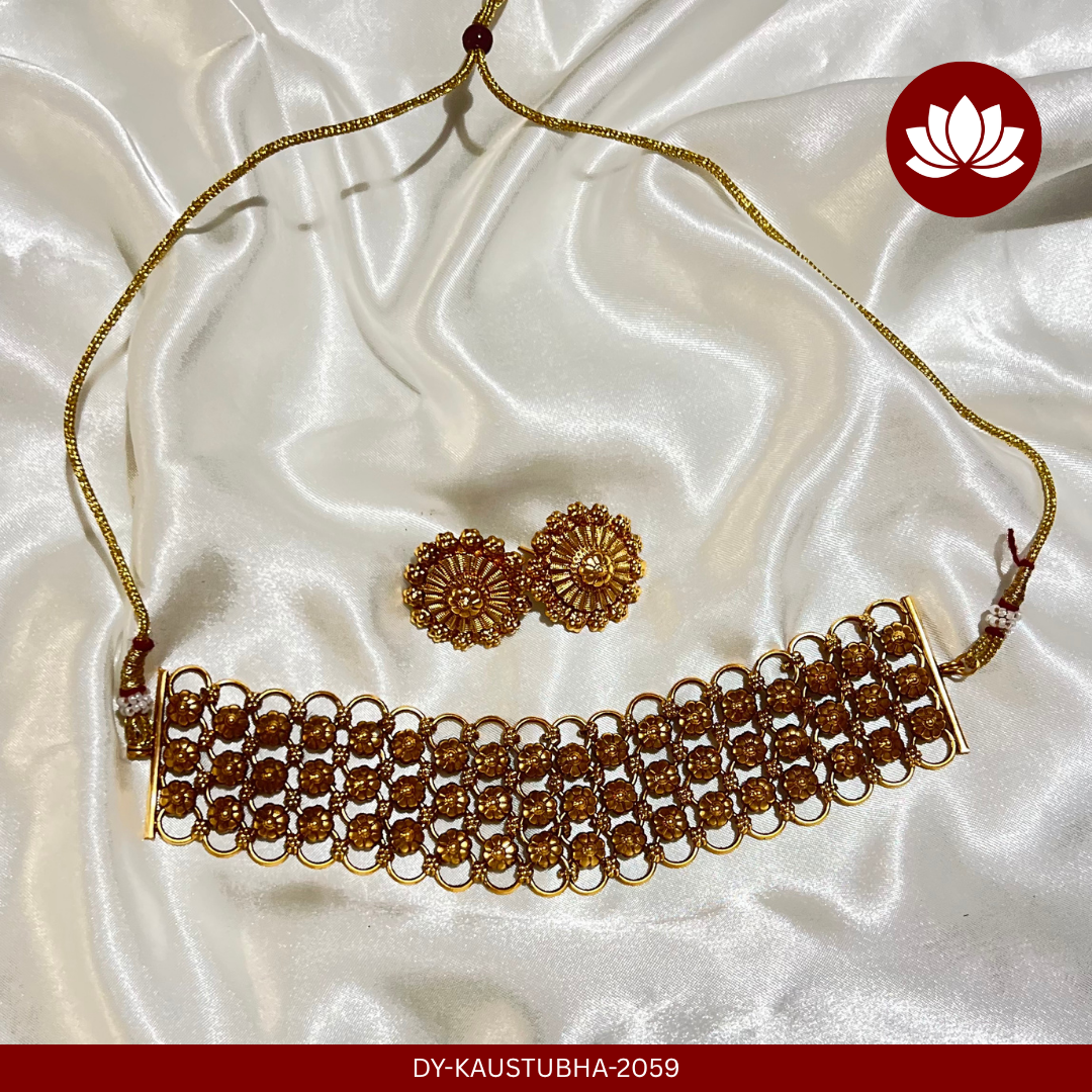 This antique piece of beauty is a perfect addition to your jewellery box. This has a matte, antique-gold tone finish, which gives it a rustic, aged, and non-reflective look. It's composed of three horizontal rows of delicate floral or rosette motifs set within a repeating scalloped or loop border. Its solid, geometric design makes it a beautiful choice for someone looking for a traditional look. The accompanying earrings are studs that perfectly match the individual floral/rosette motif, featuring the same detailed, matte finish.