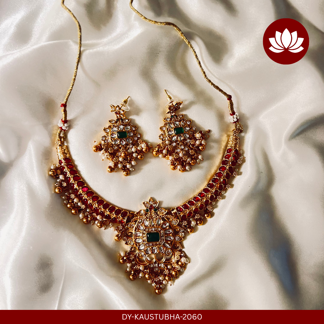 This beautiful set of antique jewellery, from our parampara collection is truly mind blowing. This antique piece is made with gold-toned or antique gold-plated base metal,with white stones for sparkle. There are deep red stones along the main band of the necklace.A prominent green stone is at the center of the pendant and in the earrings.Small, creamy white beads, resembling tiny pearls or moti, are used in bunches as drops on both the necklace and earrings. This comes with a matching ear rings featuring a cascading, dome-like design suspended from a decorative top, and they match the pendant's stones and pearl drops.