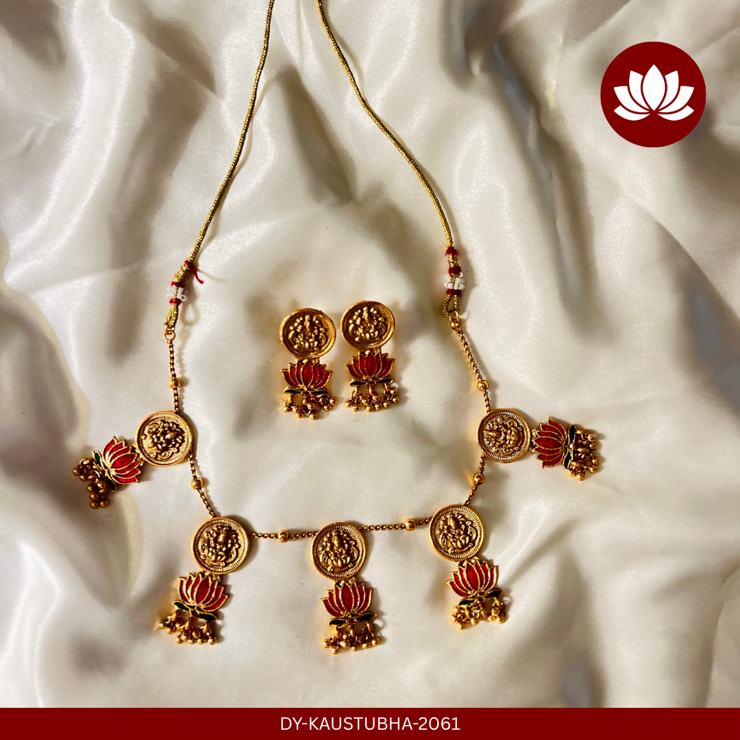 This elegant coin haram with lotus is our new addition to our Tamara series, The entire set has an antique or matte gold-plated finish and main elements are the circular coins, which appear to be embossed with the image of a deity, likely Goddess Lakshmi Separating the coin motifs are striking lotus flower (or kamal) designs, which are filled with pink and green enamel (meenakari work). he matching earrings feature a coin stud at the top, a pink and green enameled lotus dangle, and small gold bead clusters hanging from the bottom.