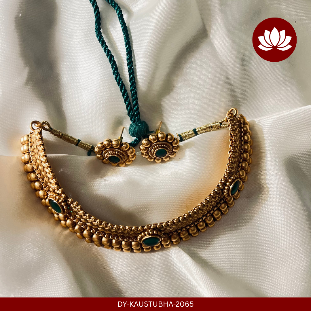 This set from our parampara series is an elegant choker enormed with red and green stones. The main body is a broad, rigid-look band featuring a central section with a detailed chevron/zigzag textured pattern. The top and bottom edges are lined with rows of smooth, small, golden beads. The design is accented with large, polished red (ruby) and green (emerald) kemp stones . it comes with a matching stud earrings that mimic the design of the border beads, featuring a central red stone set within a ring of small golden beads.